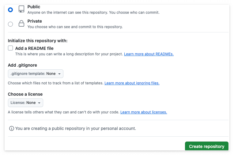 2) 공개여부, READEME 파일 생성여부, .gitignore 파일을 생성할지, 라이센스 정보등을 설정할 수 있다.