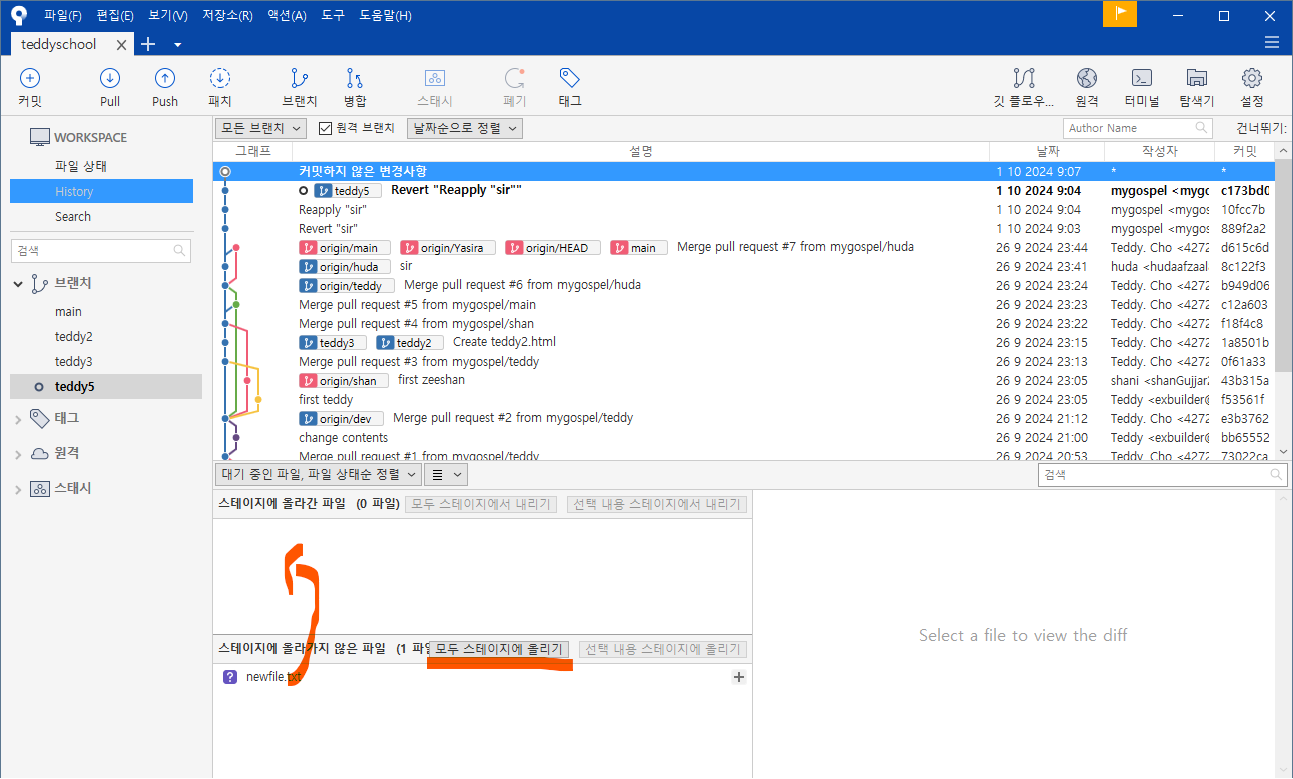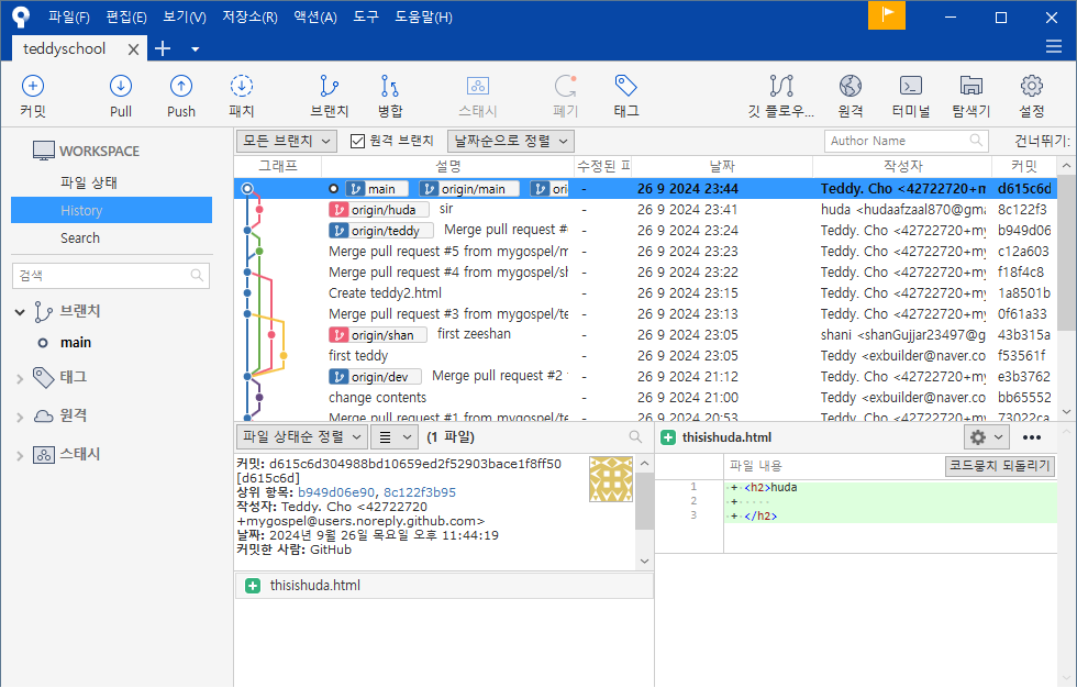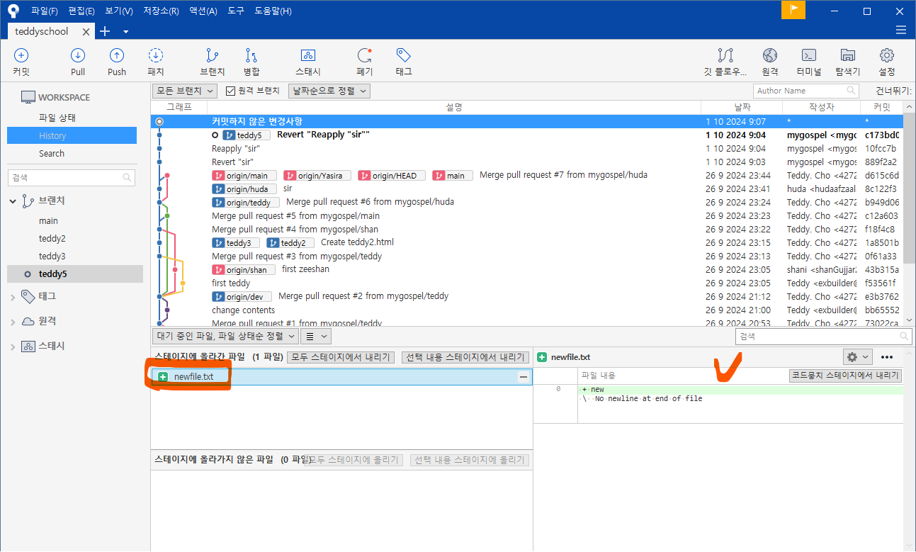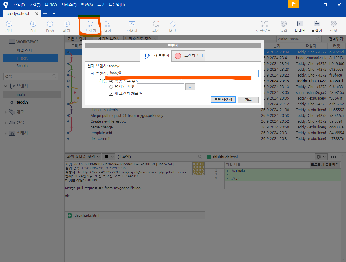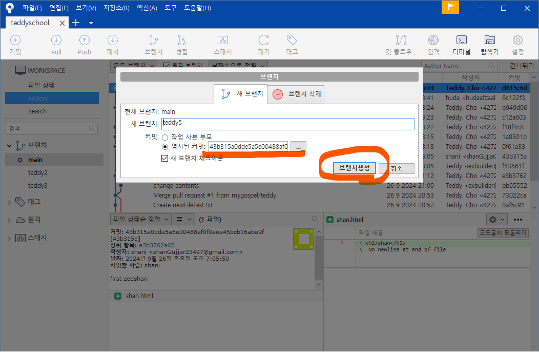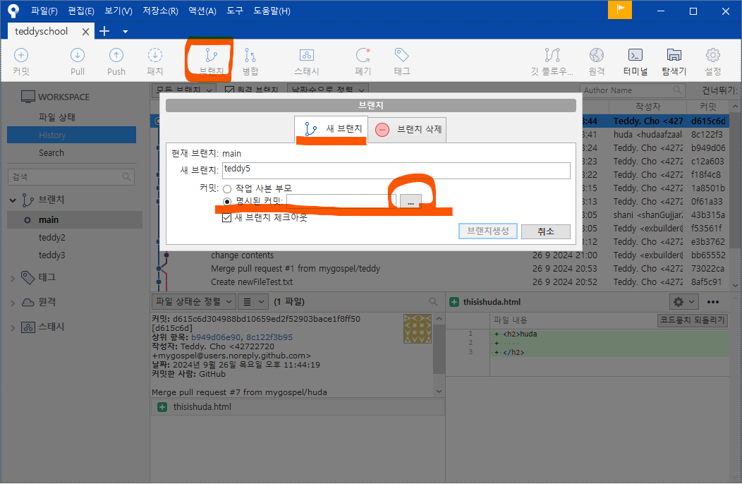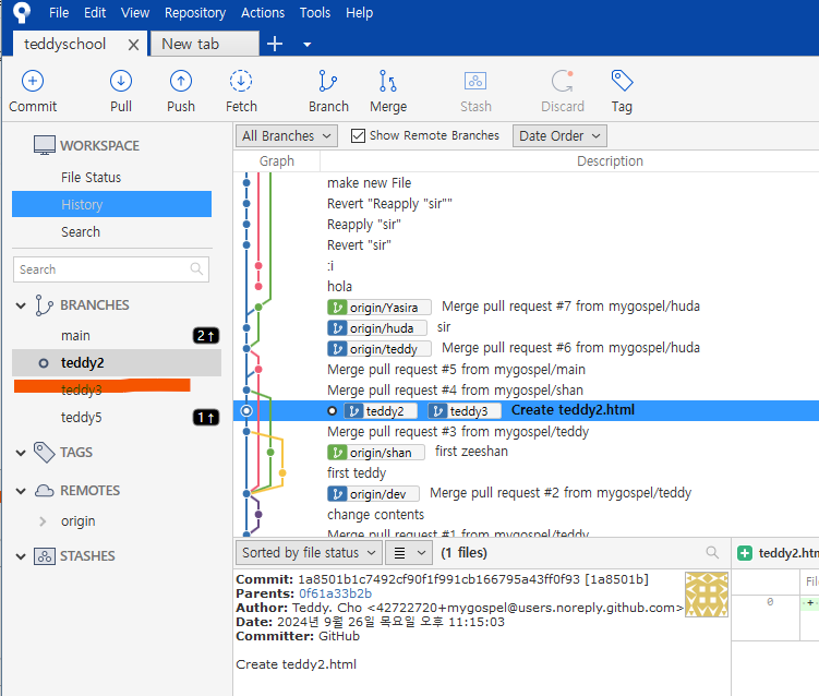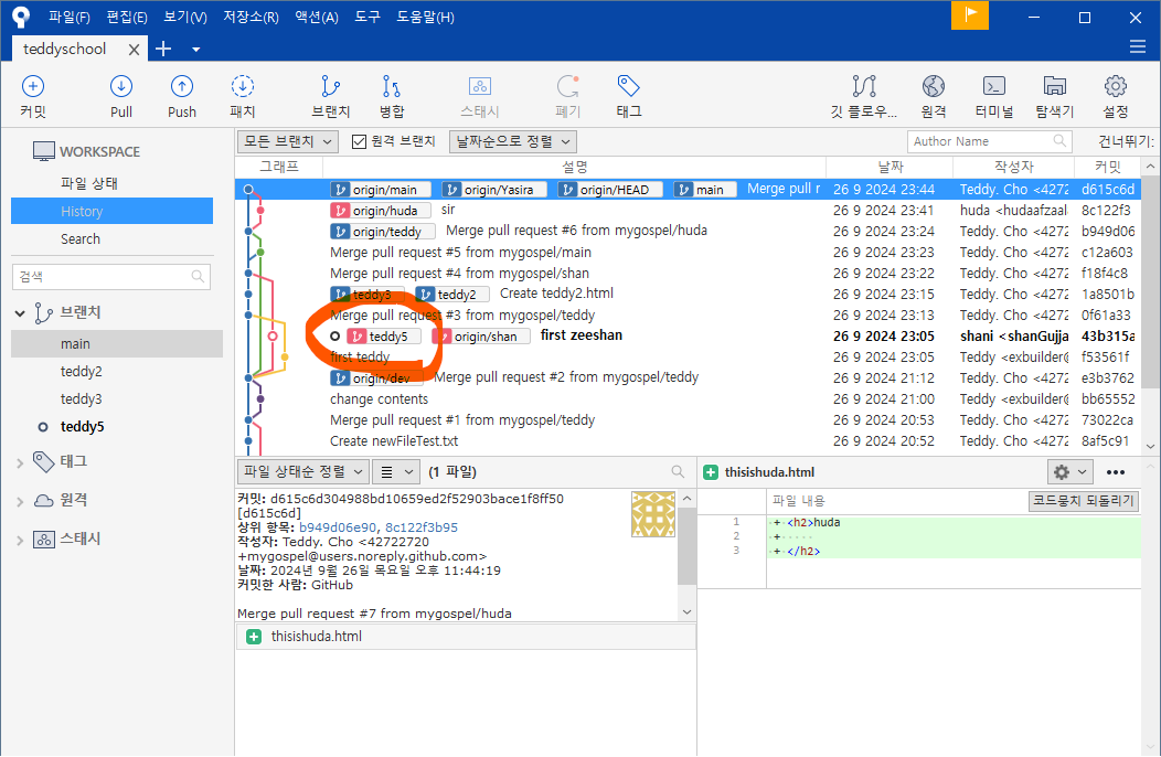 왼쪽 브랜치 목록에도 teddy5 가 생성되었습니다.