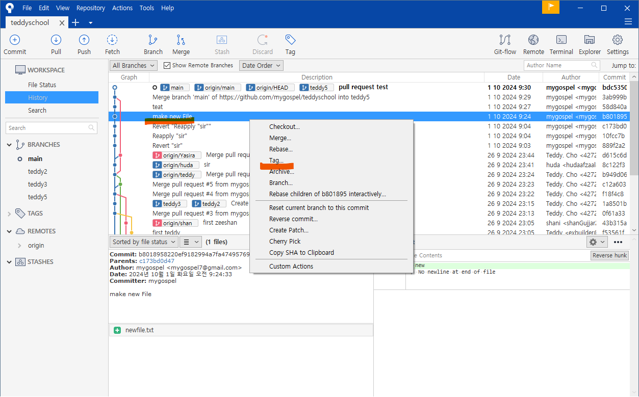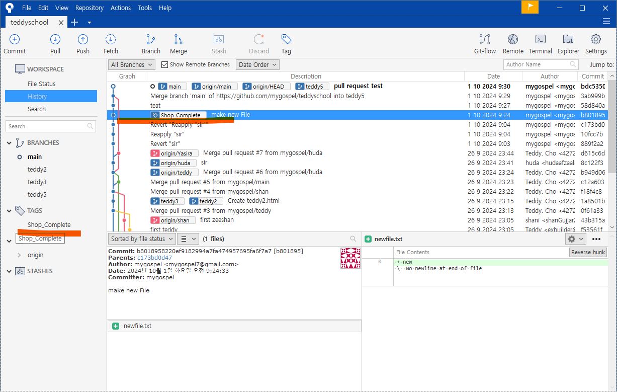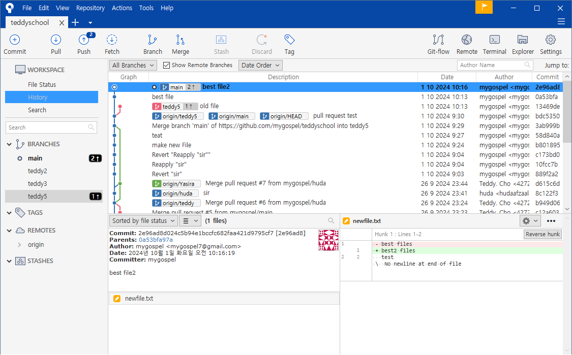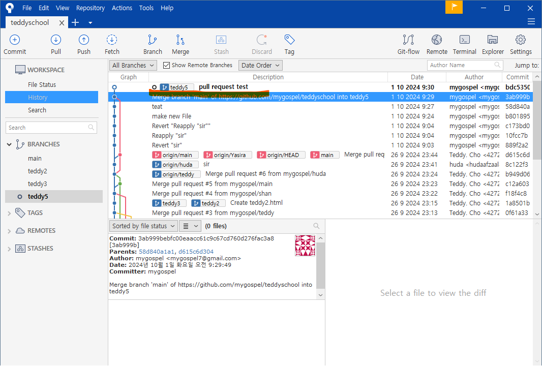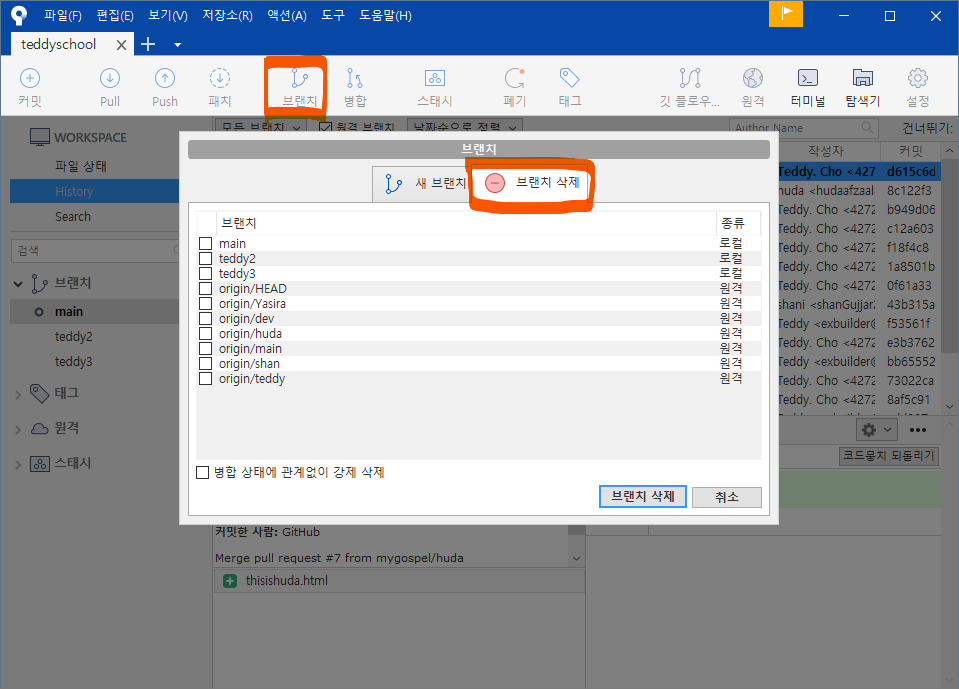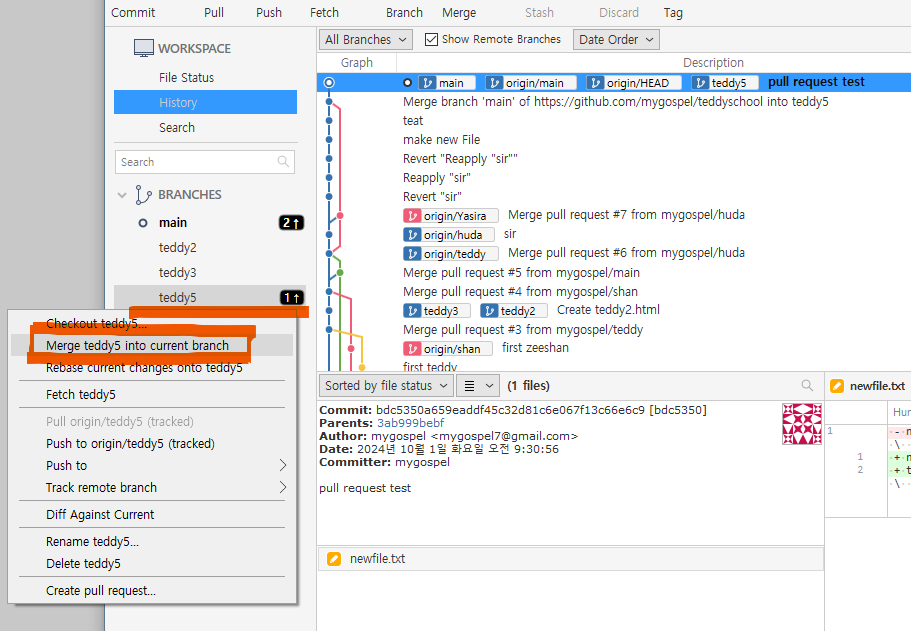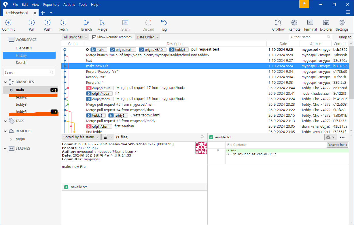 왼쪽 브랜치 목록에도 teddy5 가 생성되었습니다.