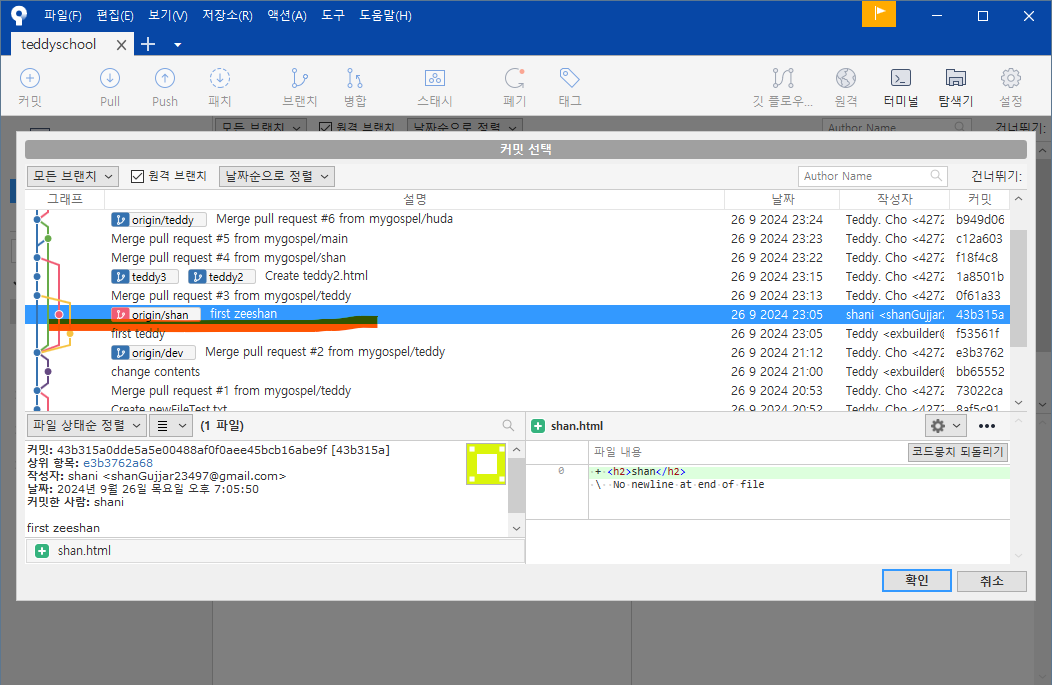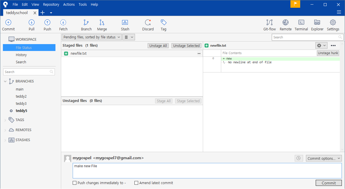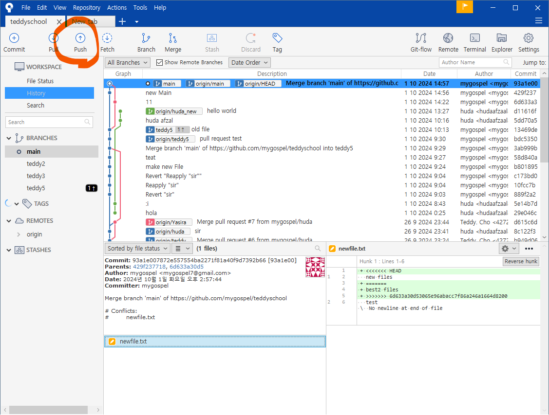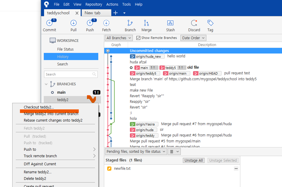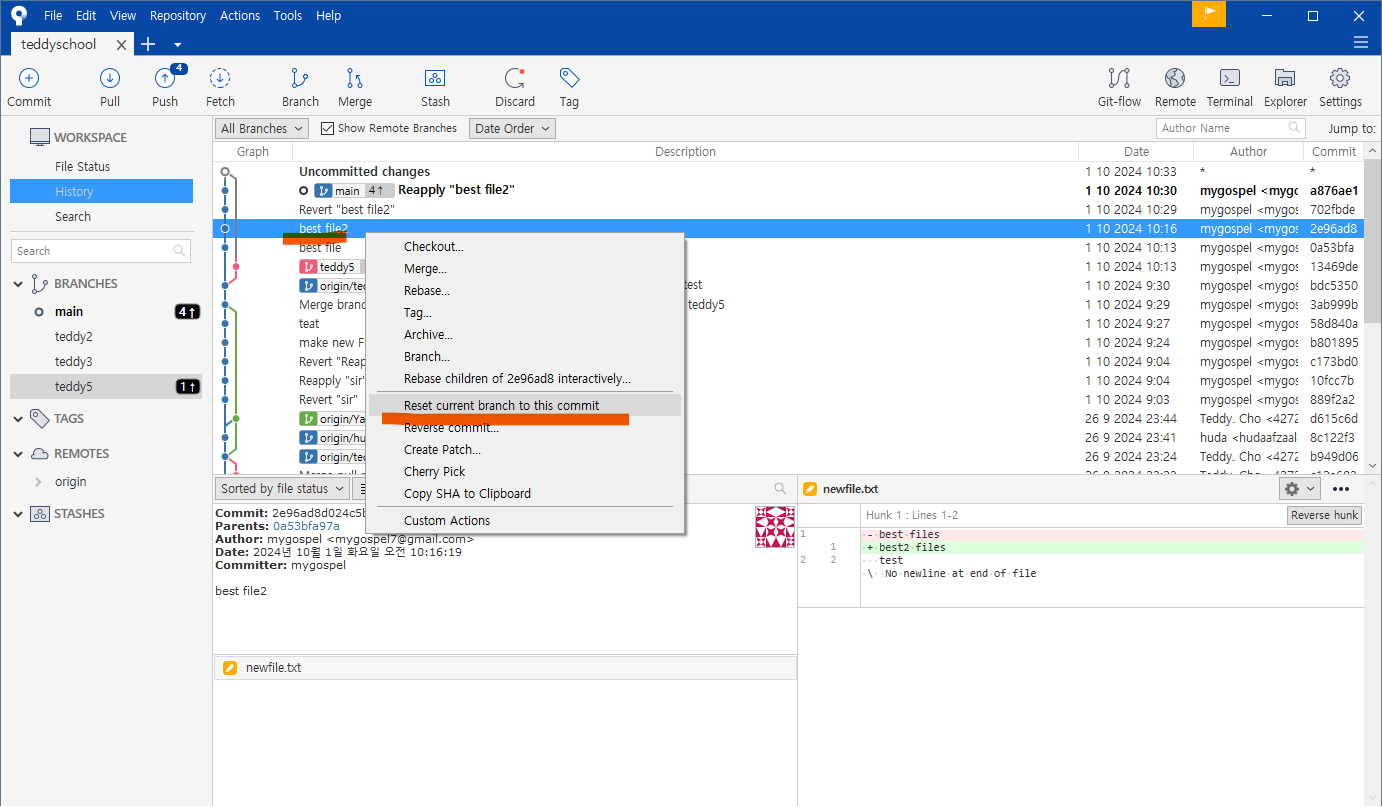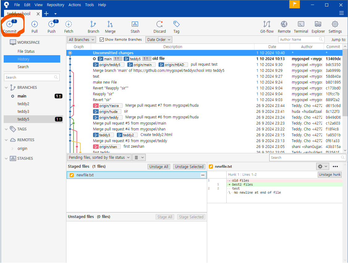왼쪽 브랜치 목록에도 teddy5 가 생성되었습니다.