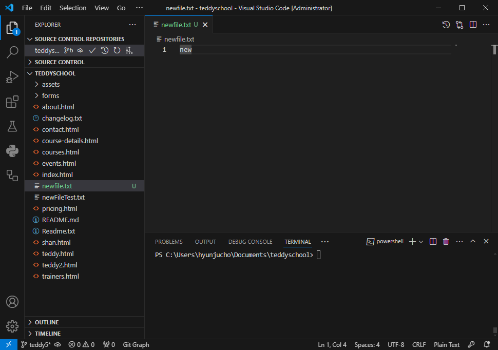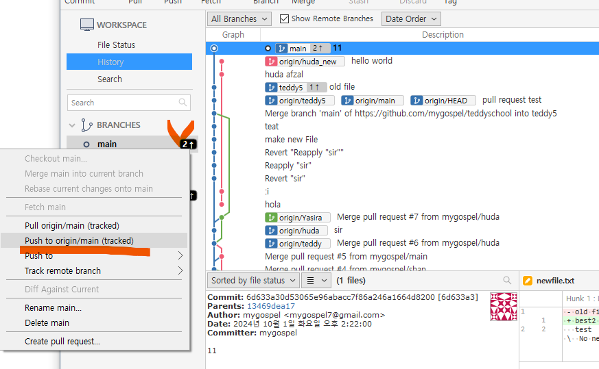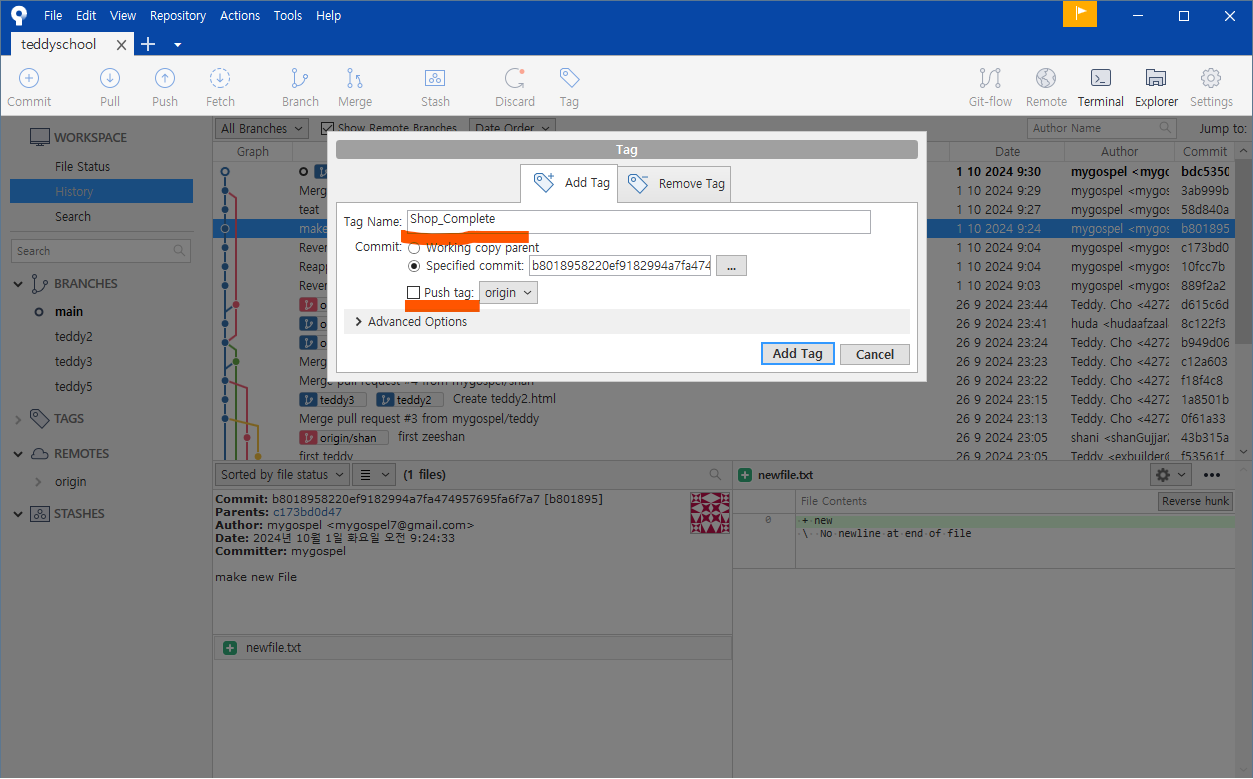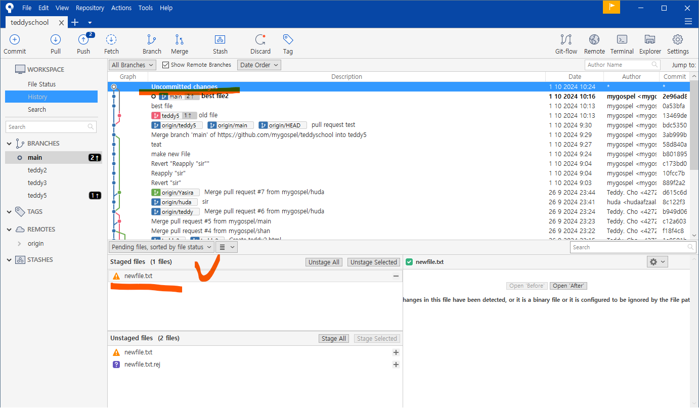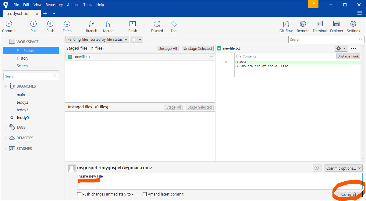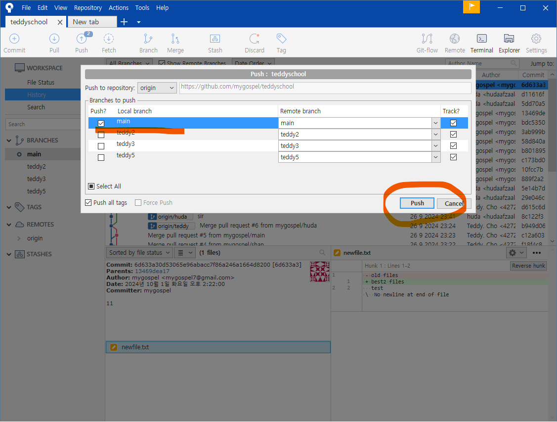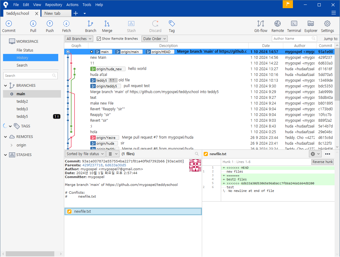 왼쪽 브랜치 목록에도 teddy5 가 생성되었습니다.
