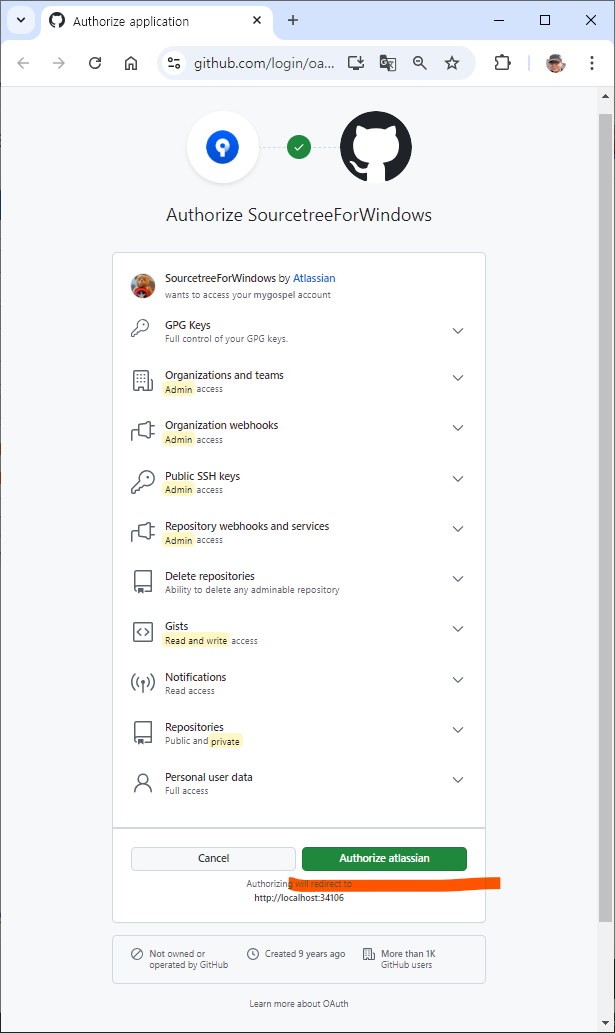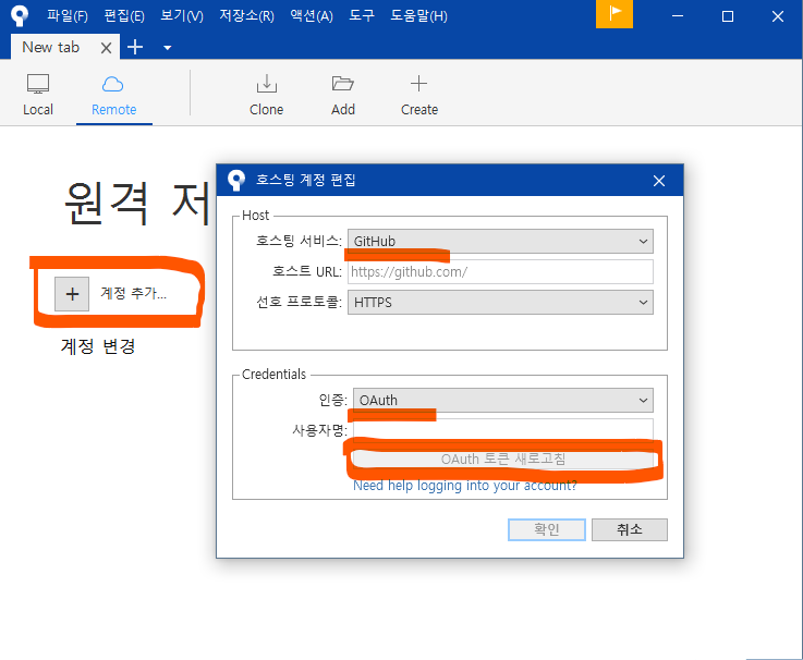 GitHub 로그인창이 나타나고, 로그인을 완료하면 소스트리 창에 내 계정이 등록되었고,