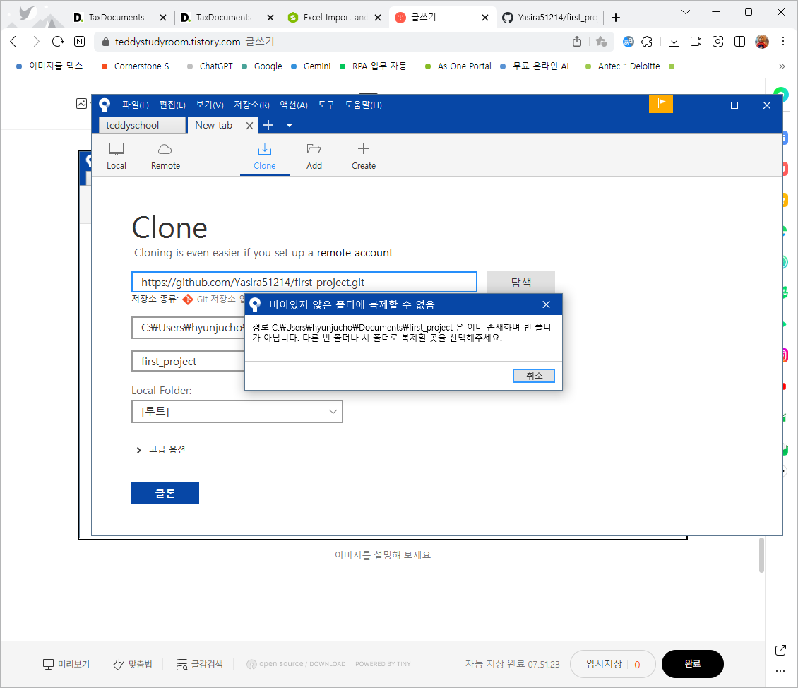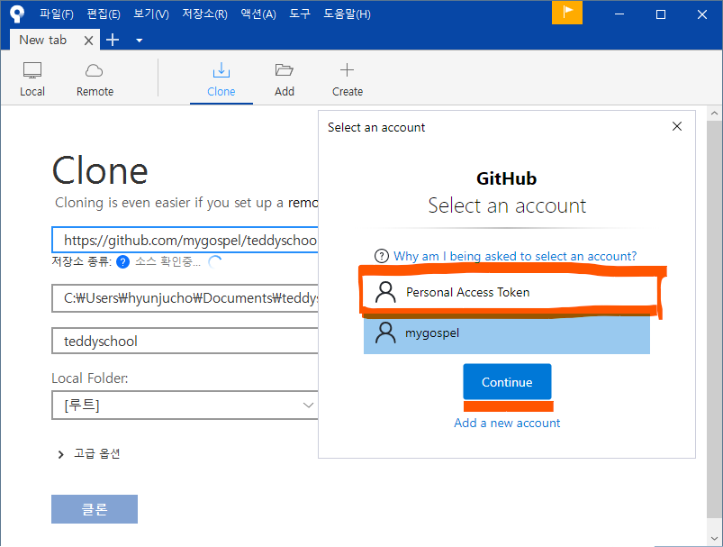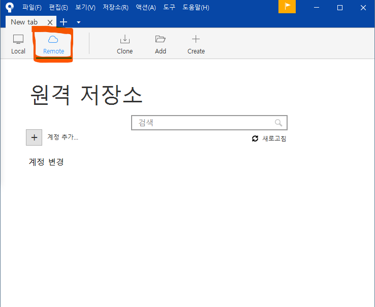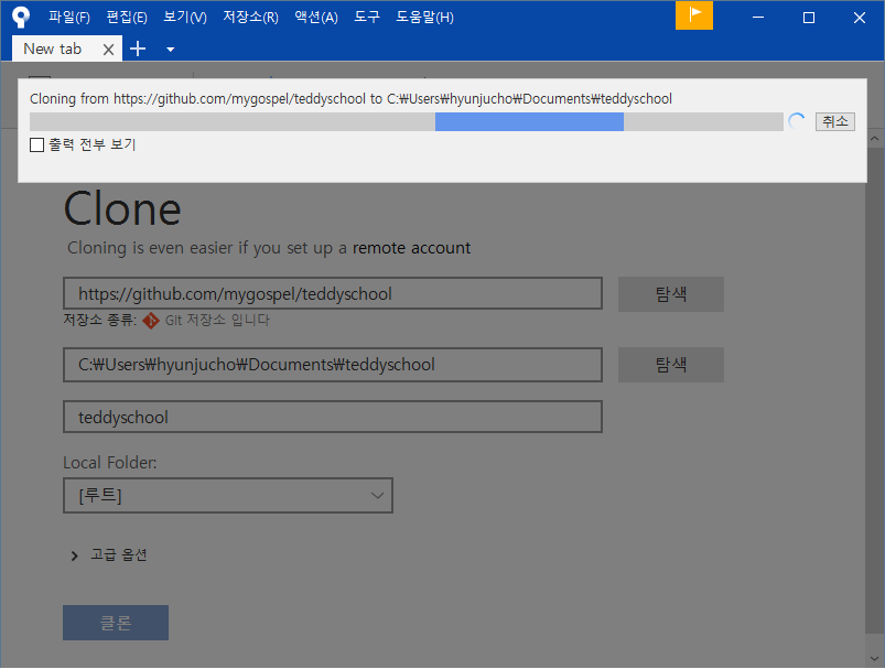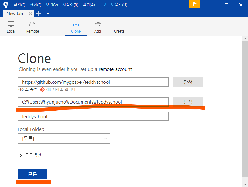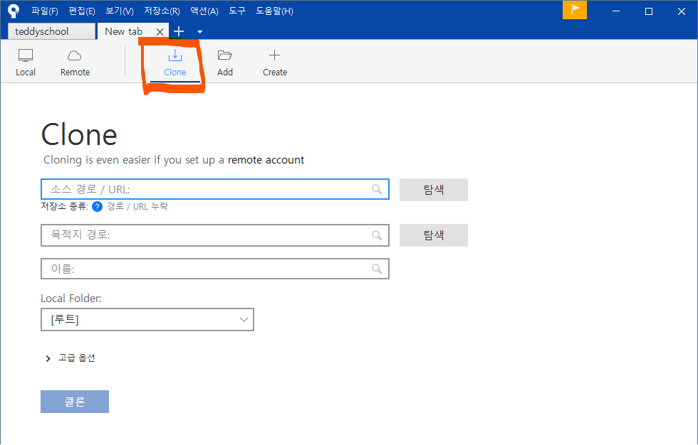 우리는 새로운 원격 저장소를 Clone 하기 위해 "Clone" 메뉴를 선택하고