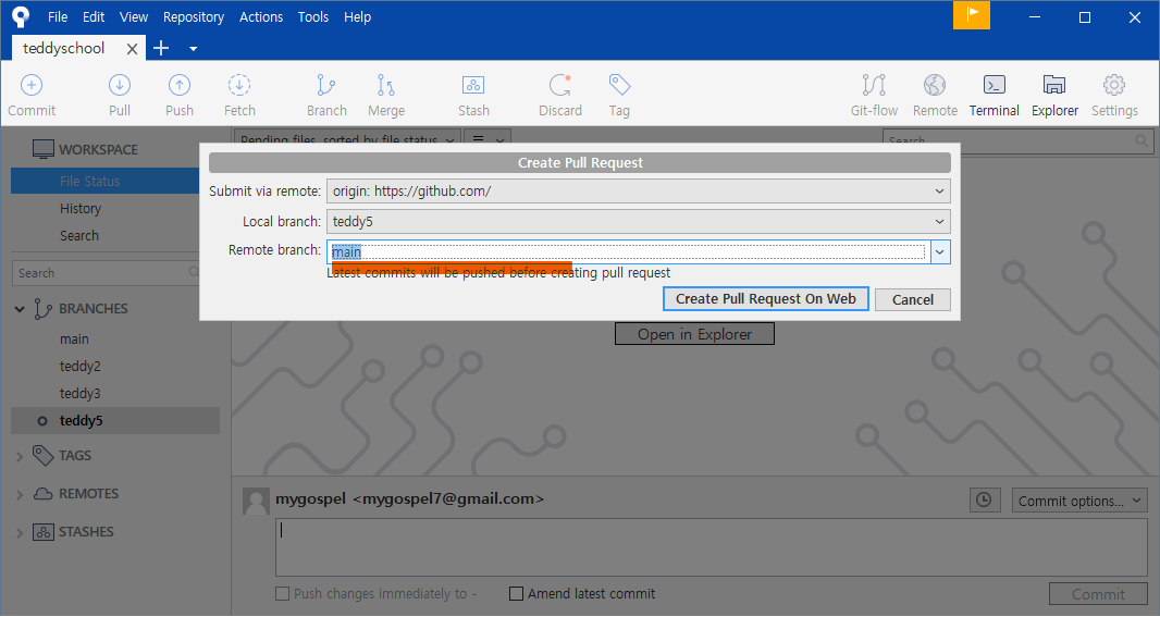 소스트리는 커밋과 함께 pull request 하기