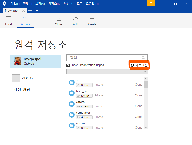 "새로고침"을 누르면 GitHub 에 있는 내 저장소 목록이 나타납니다.