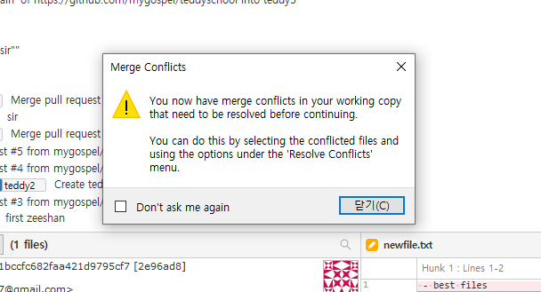 충돌된 경우 아래 처럼 메세지를 보여주고 해결을 먼저해야한다.