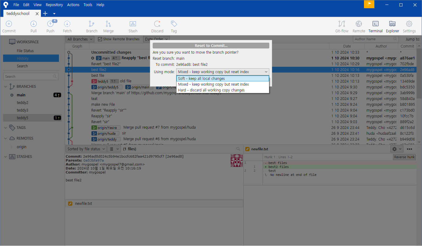 Soft 를 선택하면 변경사항은 Staging 에 그대로 유지되고 되돌아갑니다.